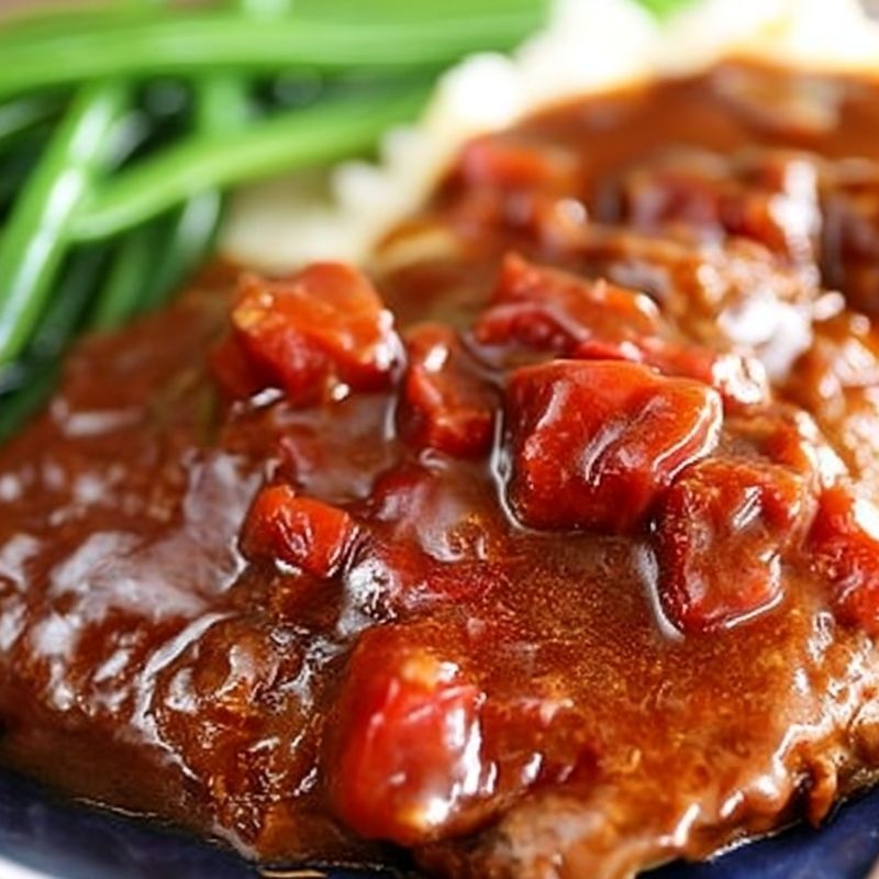 When served, the beef slices are tender enough to cut with a fork, bathed in a tomato gravy that clings to each piece. It pairs beautifully with mashed potatoes, buttered noodles, or a side of white rice — each soaking up the savory sauce in its own way. A sprinkle of fresh parsley brightens the dish just before serving, adding a touch of color and freshness to contrast the deep, comforting flavors.