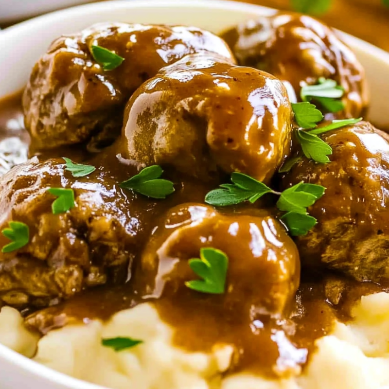 Salisbury Steak Meatballs are tender beef meatballs simmered in a rich, savory gravy. A comforting classic perfect over mashed potatoes or noodles.