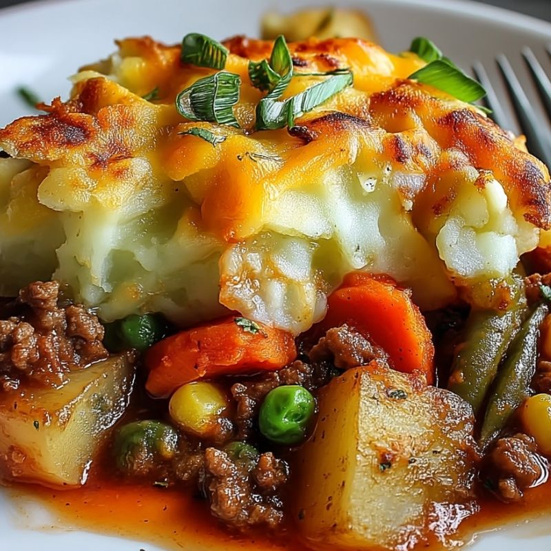 This Hearty Baked Shipwreck Casserole layers seasoned ground beef, fresh vegetables, and potatoes in a savory tomato sauce, finished with melty cheddar cheese for a comforting all-in-one meal.