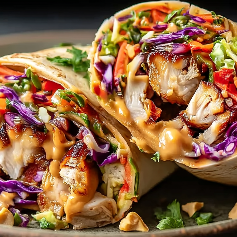 This Thai Chicken Wrap pairs juicy marinated chicken with a tangy peanut sauce and crunchy Asian slaw, all wrapped in soft tortillas for a fresh and flavorful bite.